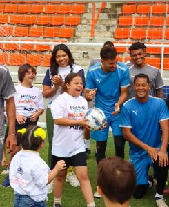 Los alegres niños y niñas contagiaron a los jugadores con sus sinceras sonrisas, aprovechando para correr sobre el césped y patear balones, logrando algunos vociferar el frito del ¡Goool!