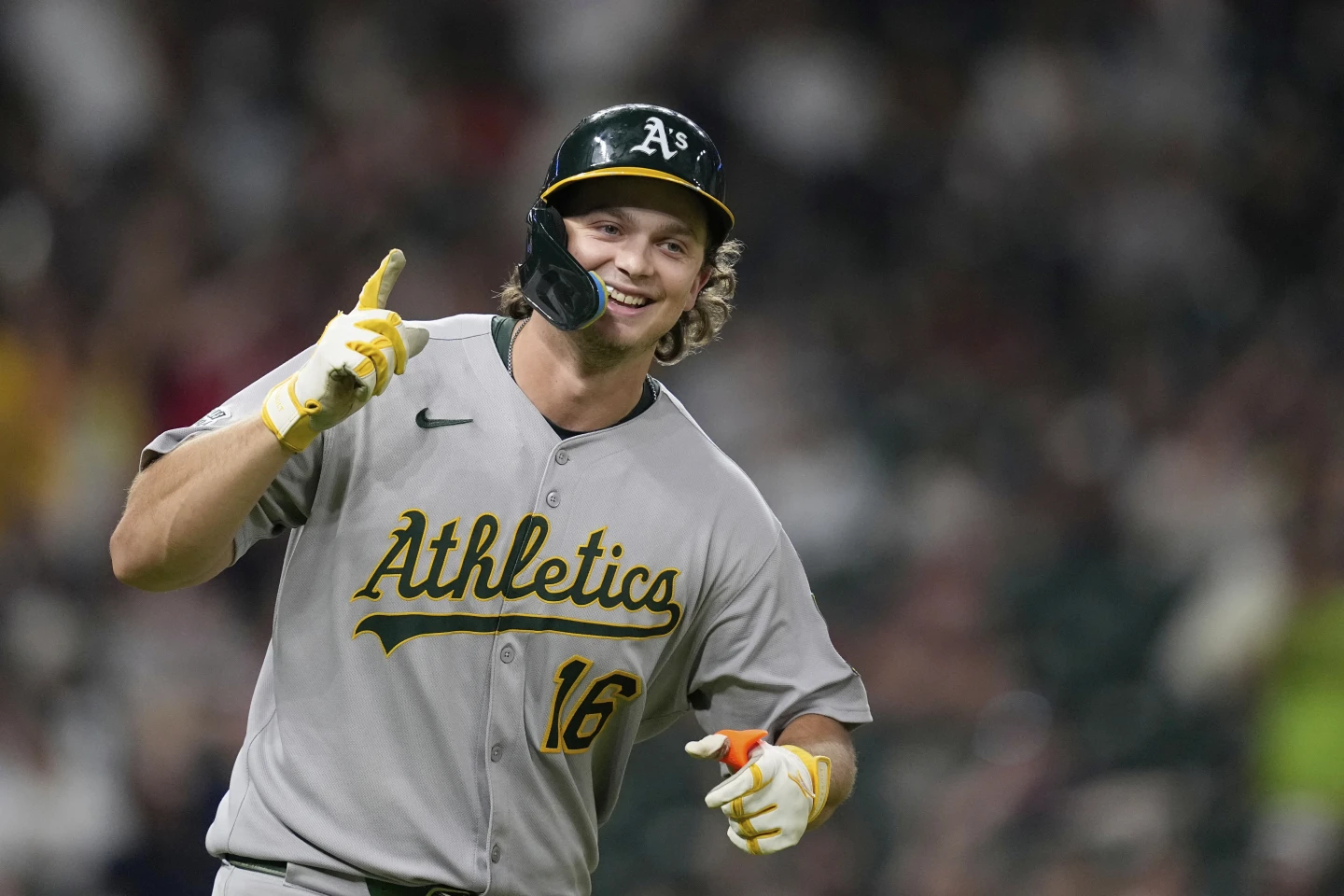HOUSTON, TEXAS – 25 de julio: Nick Kurtz, de los Atléticos, reacciona después de conectar un jonrón de dos carreras en la segunda entrada contra los Astros de Houston en el Daikin Park.