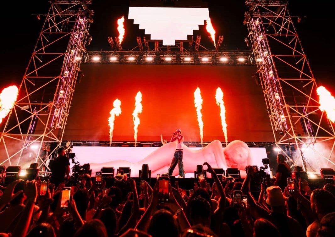En el cierre, una silueta gigante de mujer se desplegó en el escenario para dar paso a su éxito “Veldá”, grabado junto a Bad Bunny, mientras el artista ondeaba una bandera dominicana entre aplausos y ovaciones.