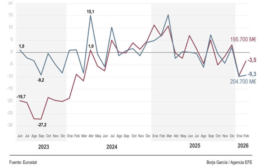 En términos globales, el superávit comercial de la Unión Europea con el resto del mundo también registró una caída superior al 60 %, al pasar de 22.900 millones de euros a 9.100 millones entre febrero de 2025 y febrero de 2026.