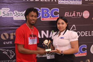 Tavárez recibió el trofeo Cooperativa San José, así como regalo de Farmacia GBC por parte de Diosmayra Rodríguez.